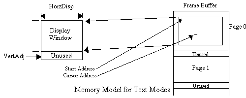 In text modes the 16-KB frame buffer is divided into pages. Each page is an array of character/attribute pairs organized into rows. The character/attribute pairs of each row of the display are stored in a vector sequentially from left to right. The top row of the display is stored first with lower rows following.