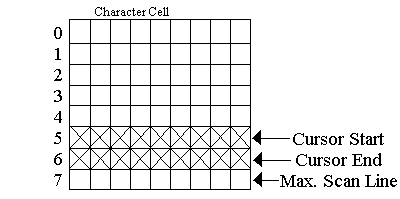 The cursor (CurStart and CurStop registers) and underline (Underline register) are chosen to match the character font. To be MDA/CGA compatible: 1) the cursor height should be set to two scan lines, 2) the cursor stop line should correspond to the last line of the cell for short fonts and the second to the last line for tall fonts, 3) the underline should correspond to the cursor stop line.