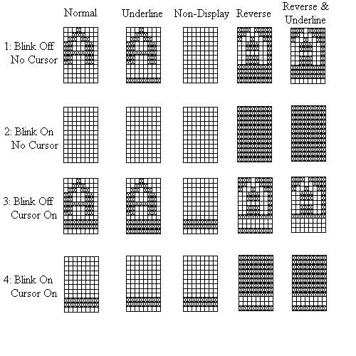 Row 4 shows the effect of the blinking attribute on a character overlaid by a cursor. If the cursor is nonblinking, the character alternates between the row 3 and row 4 displays at half a second per display. If the cursor is blinking, the character alternates between the row 1 and row 4 displays at half a second per display. If the cursor is flashing, the character spends half of each second alternating (at half the frame rate) between the row 1 and row 3 display, and the other half of each second altern ating between the row 2 and row 4 display.