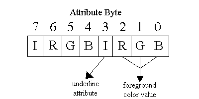 Attribute Byte 76543210 Attribute ========================================================================================== 000 000 Non-display (white on white) ------------------------------------------------------------------------------------------ xxx 001 Underline (black on white) ------------------------------------------------------------------------------------------ 111 000 Reverse video (white on black) ------------------------------------------------------------------------------------------ all others Normal (black on white) ------------------------------------------------------------------------------------------Bit 3 of the attribute byte may be used to intensify the foreground or to underline the character. If bit 6 of the mode register is clear, bit 3 of the attribute byte intensifies the foreground. If bit 6 of the mode register is set, bit 3 underlines the character.