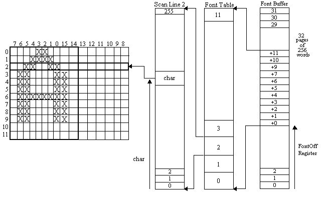 These pages are grouped into font tables. A font table contains all of the pixel information for a given character set. A font table requires as many pages as there are scan lines in that character set, up to 32 lines. The higher numbered scan lines correspond to higher pages within the font table (with wraparound). The font buffer can contain font tables for several character sets. The FontOff register points to the page containing the first (topmost) scan lines of the c urrent character set.
