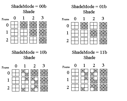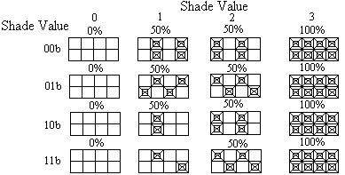 The first two techniques result in effective shading intensities of 0, 50, 50, and 100 percent. The last two techniques result in effective shading intensities of 0, 25, 50, and 100 percent. The differences between techniques 00 and 01 and between 10 and 11 is that dithering is enabled across scan lines. This should help break up vertical bars that would occur if large areas of the display were set to the same color.