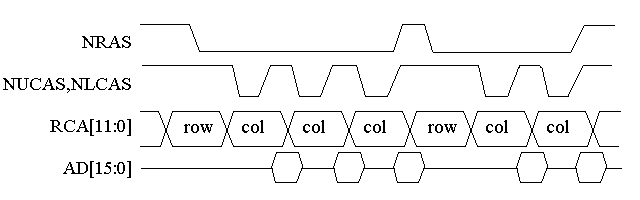 The following figure shows a sample display RAM access. Three accesses are made before a page fault occurs (the row address changes), then two more accesses are made. The signal NRAS is the one of the four NRAS[3:0] (row address strobe) pins that the buffer is mapped to.