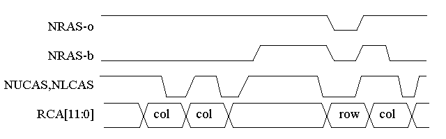 The following figure shows a group of column accesses interrupted by a RAM refresh. In this figure, NRAS-b is the NRAS for the memory device containing the accessed buffer and NRAS-o are the remaining (other) NRASs.