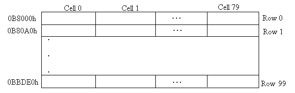 When configured for CGA Mode 3, the display memory is organized similar to that for the MDA display, except that there are four 80 x 25 pages of text starting at the base address B8000h. The Display memory buffer size is 16 KB with pages beginning on 4-KB boundaries. The attribute byte is used for background (hi nibble) and foreground (lo nibble) color processing. Color (4 shades of grey) and Contrast Restore will be enabled as the default.