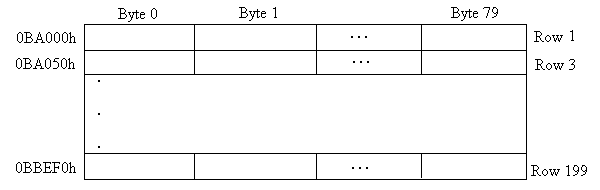 When configured for CGA Mode 6 the display memory is organized as 200 scan lines consisting of 640 bits each. Each byte in the scan line corresponds to eight contiguous pixels in the display. The most significant bit in each byte corresponds to the leftmost displayed pixel. The scan lines are interleaved in memory with all of the even-numbered scan lines contiguous and starting at the base address B8000h. The odd-numbered scan lines are contiguous and start at base address BA000h.