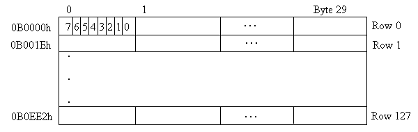 Within each byte of display memory, bit 7 maps to the leftmost pixel and bit 0 maps to the rightmost pixel. The upper left pixel of the display image in the window used to show the image is bit 7 of 0B0000h.