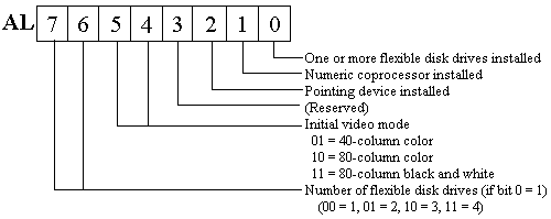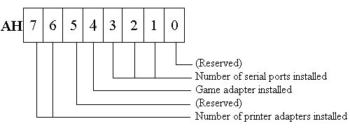 The BIOS returns a copy of its internal equipment list in the AX register. The list is compiled in the RAM word variable DEVFLG (40:10).
