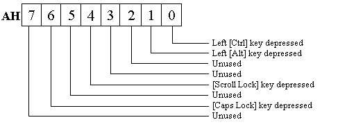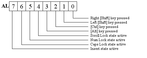 This function returns an extended shift status byte in AH. The byte returned in AL is the same as that returned by function 02h.