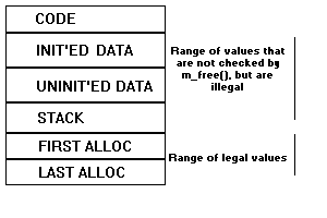This function shrinks the data space claimed by the application by releasing all memory beyond ptr. Applications should make sure that the value of ptr is above or equal to the first value returned by m_alloc(). m_free() tests to make sure that the offset is within the range of the currently allocated block, but it does not test to see that it is beyond the initial allocation at load time.